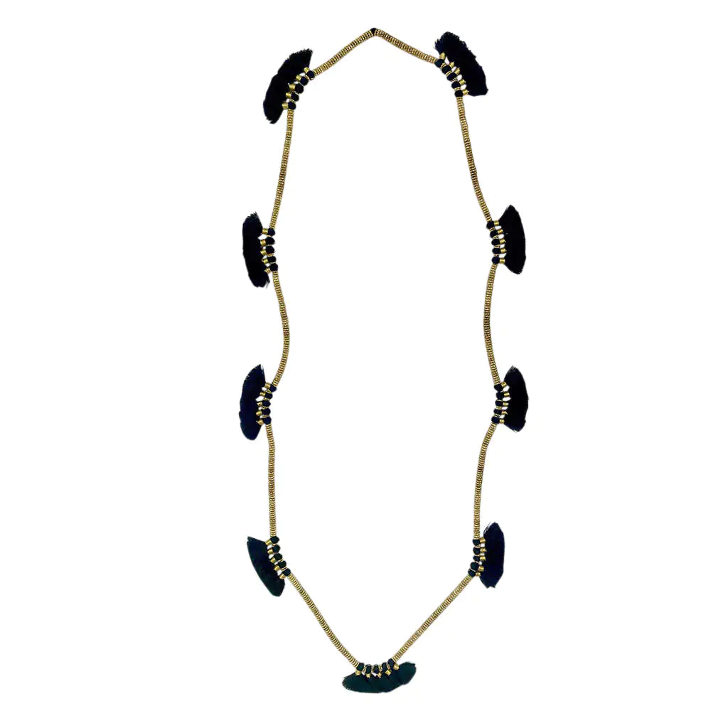 This long, feminine necklace is embellished with cotton tassels and adds a fun pop to any look! The delicate design is a mix of traditional Indian techniques with modern bohemian.