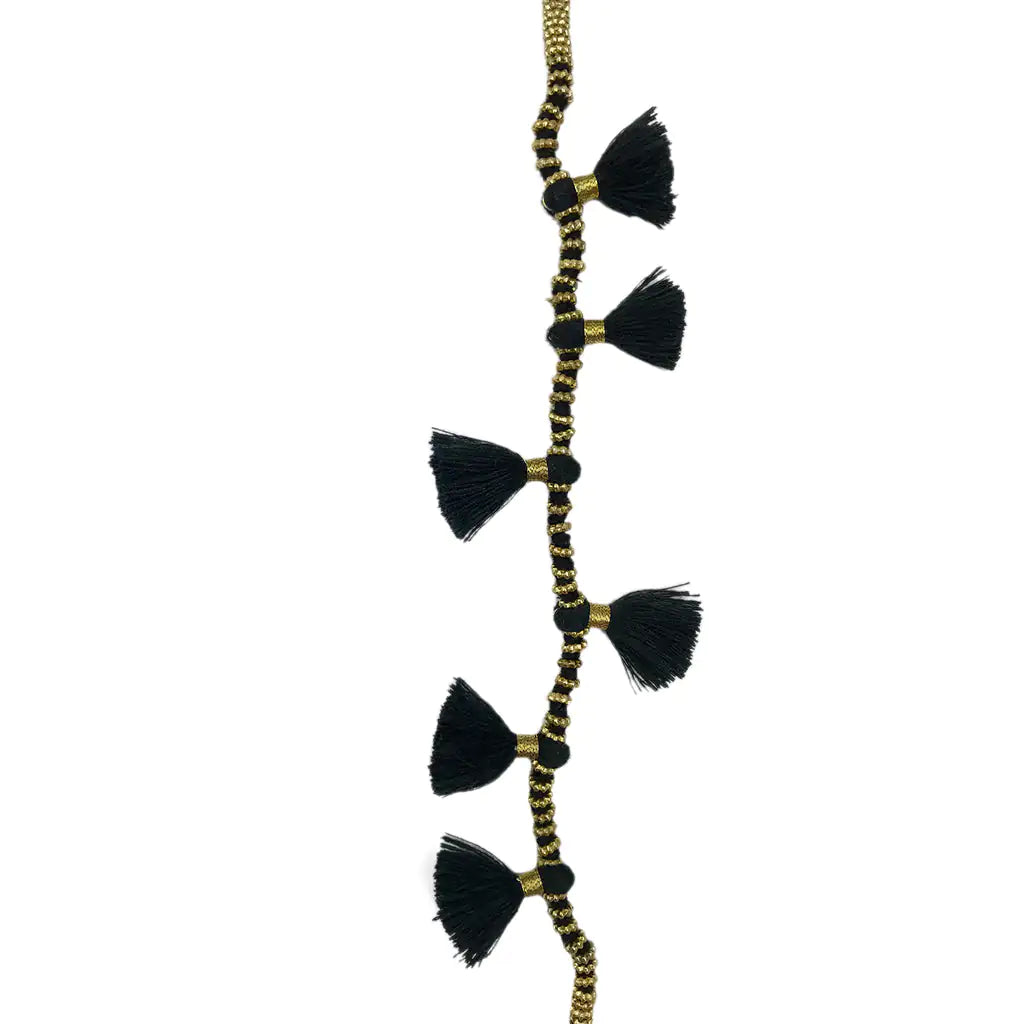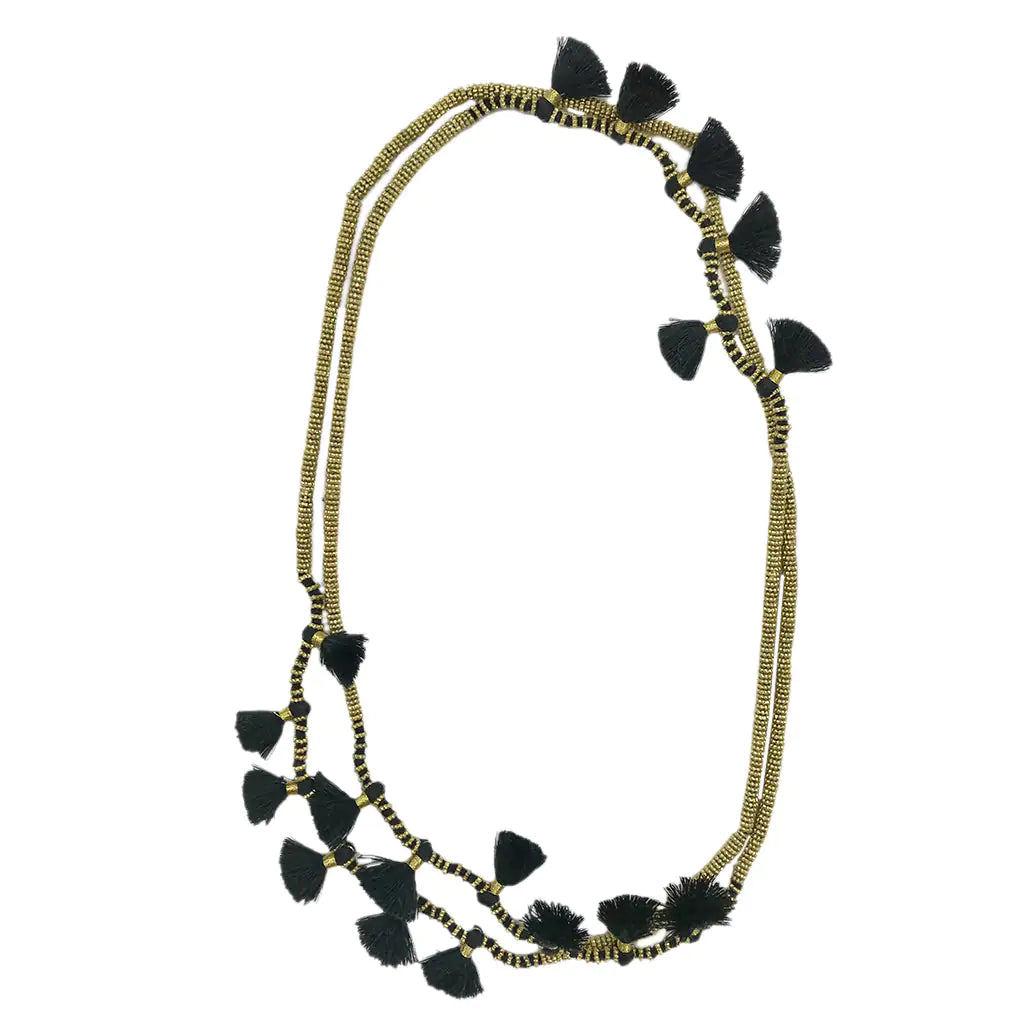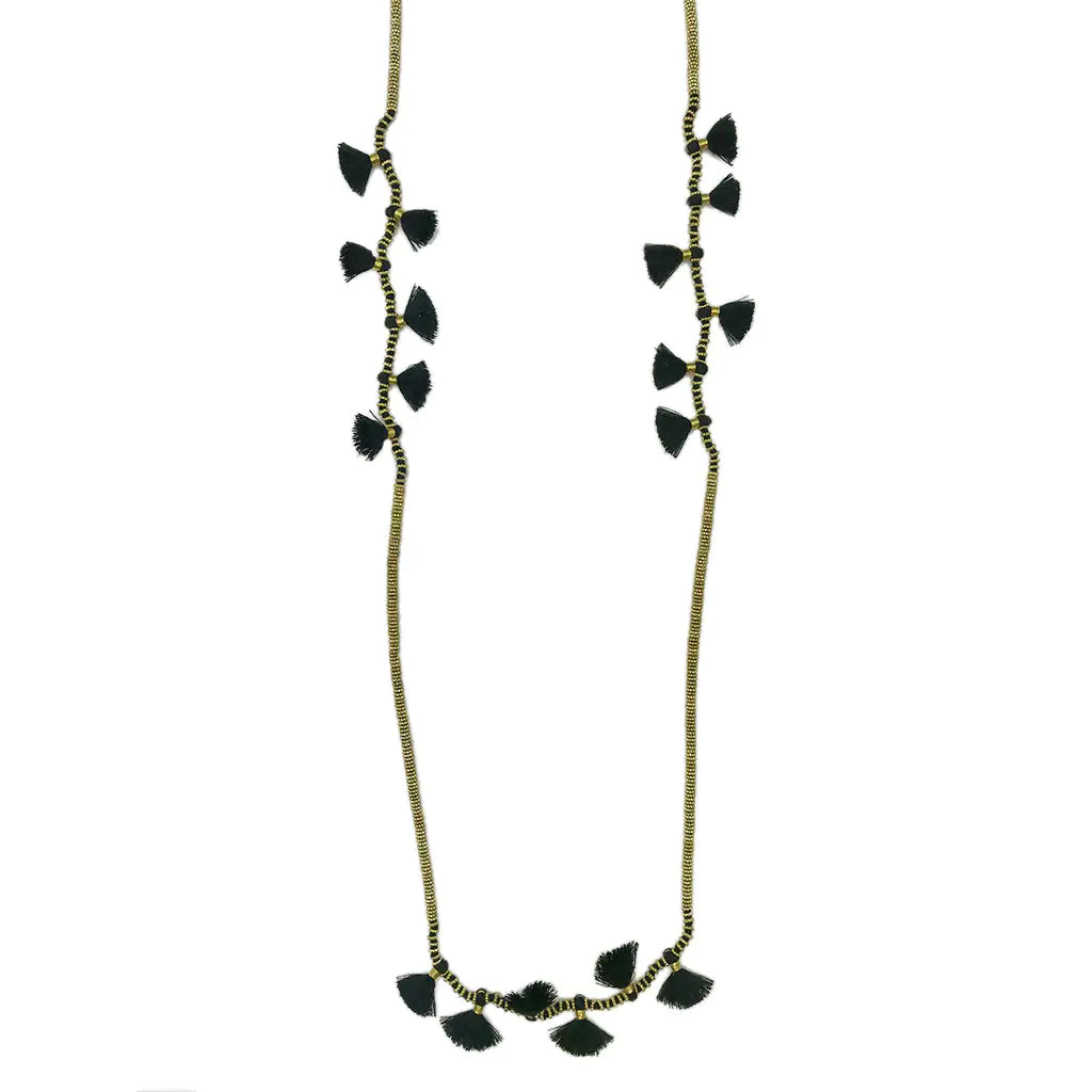 This long versatile necklace is adorned with cotton tassels and can be worn multiple ways. The delicate design is a mix of traditional Indian techniques with modern bohemian.