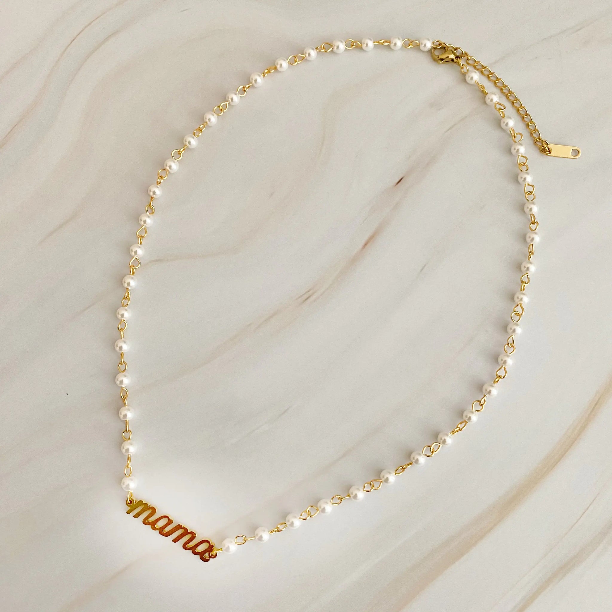 This Mama Pearl Chain Necklace features a beautiful pearl chain with a scripted MAMA cutout pendant, making it the perfect accessory for stylish moms. The elegant design works great as a statement piece on its own, or layered with other necklaces. Gift your mom with an elegant accessory she will love.