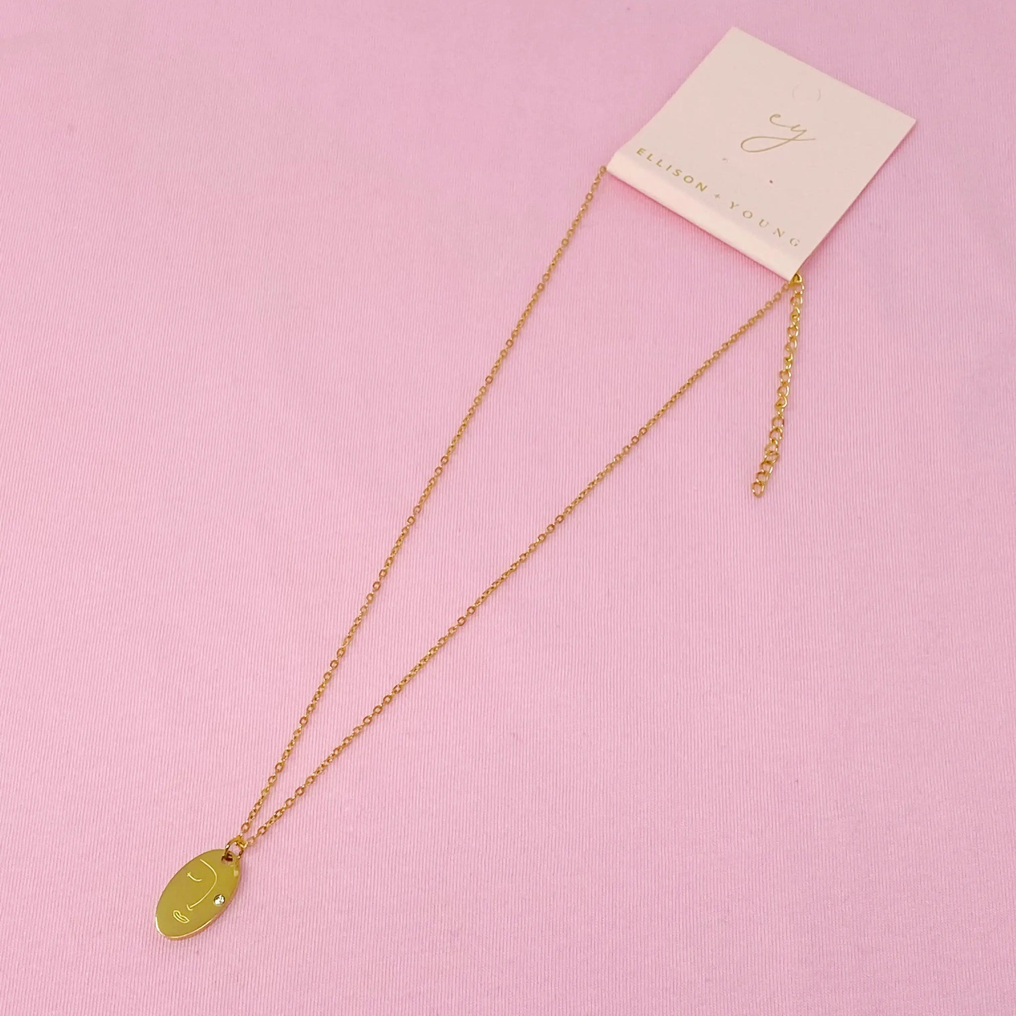 Simple chain necklace with pendant detailed with a unique oblong shape face and cubic zirconia on the front. On the back, is a smooth polished finish giving it a exclusive look! Such a versatile necklace!