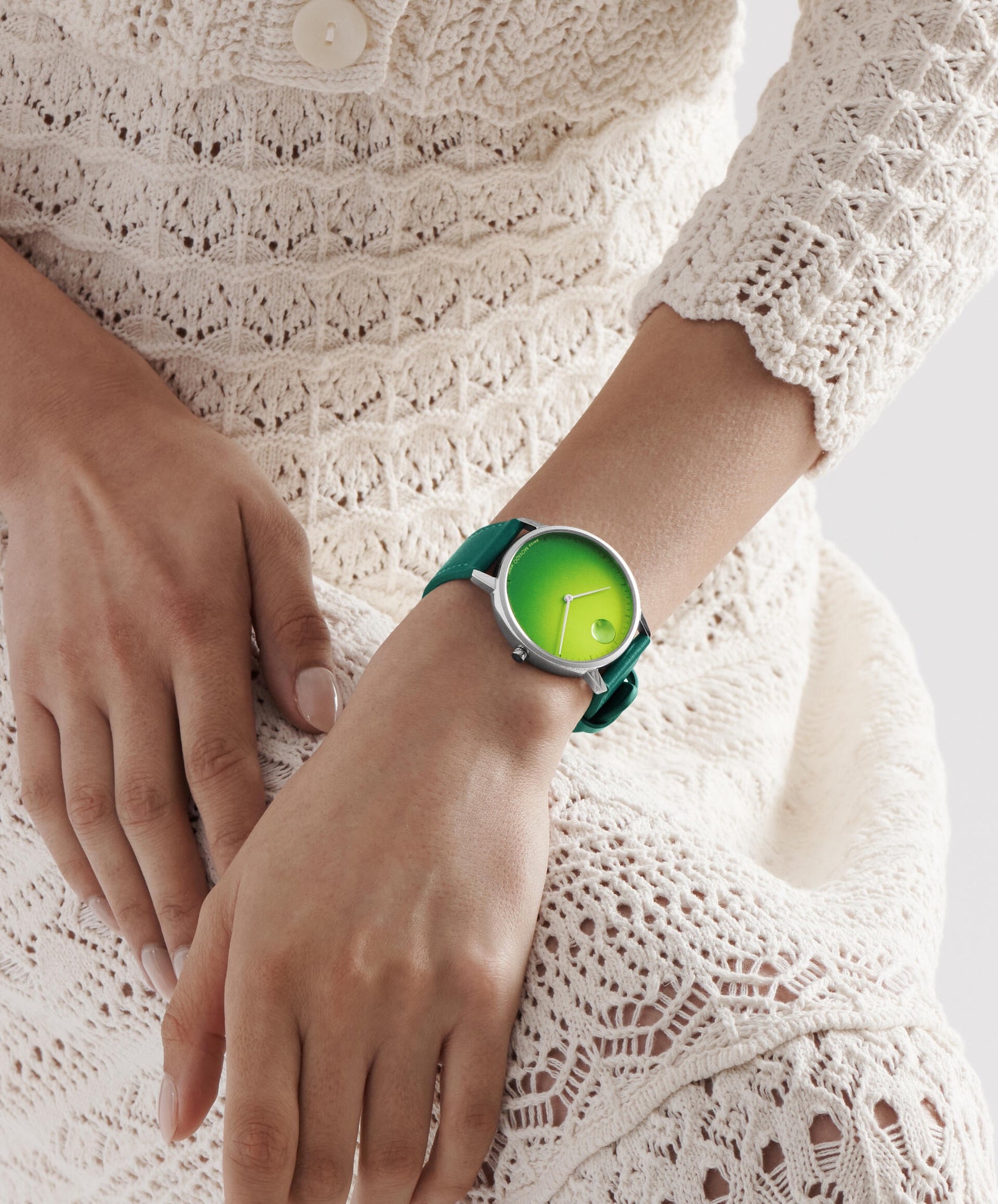 A fresh, fun take on ultra-modern, hyper-minimalist design. Add a pop of color to any look with this vibrant Face watch. Its 41mm stainless steel case houses a green ombre dial with slim steel hands and a recessed dot at 12 o’clock. We’ve paired it with a cool green strap crafted from luxe leather with a buckle closure.