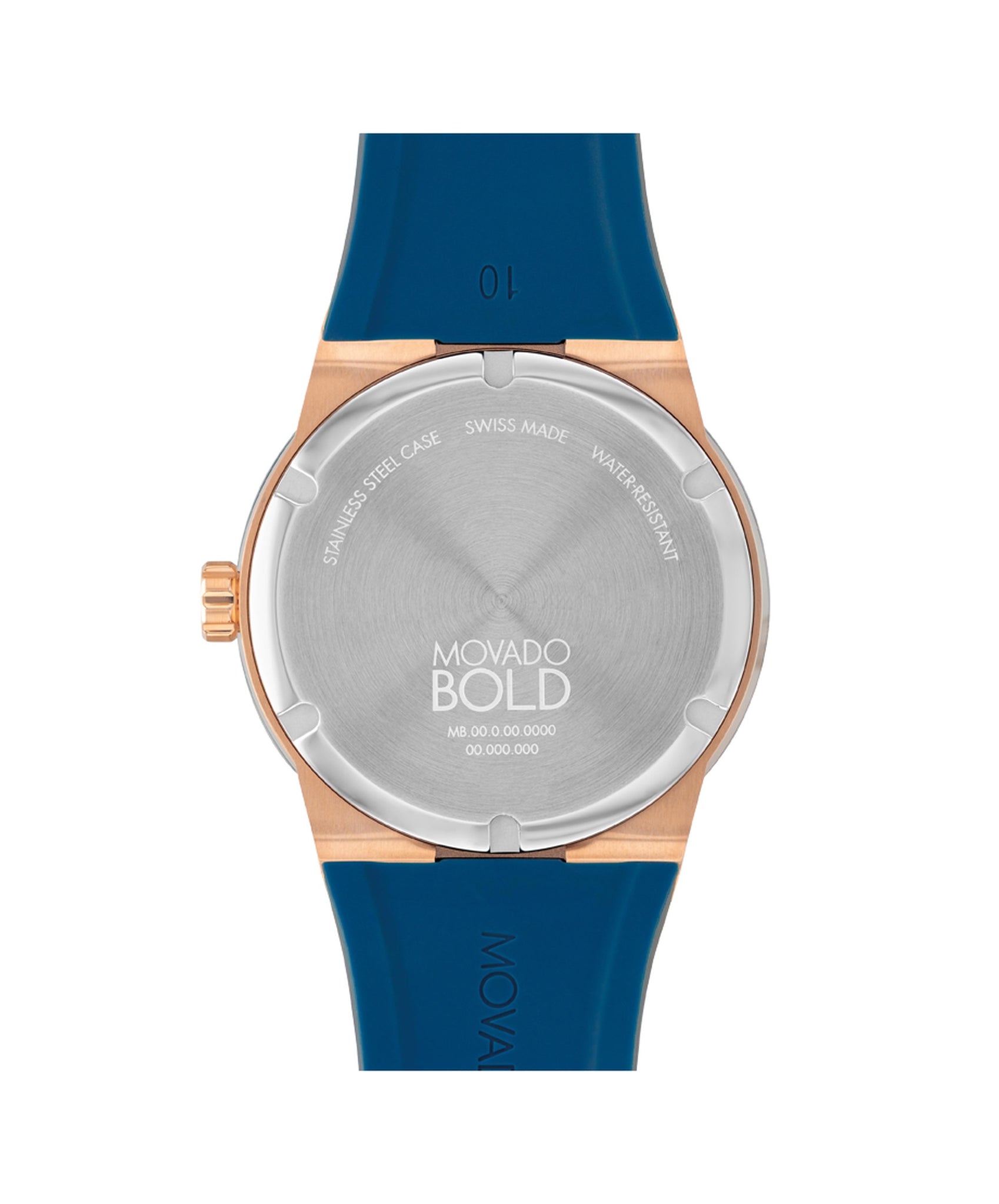 Sporty style with contemporary-cool edge. This BOLD Fusion watch features a super sleek navy silicone strap for an undeniably modern feel. This minimalist design features a 42.3mm case crafted from rose goldtone ion-plated stainless steel with a navy ceramic bezel. The matching dial boasts our iconic dot motif at 12:00, a date window, and Swiss Super-LumiNova® accents at hour and minute hands. A buckle closure completes the design.
