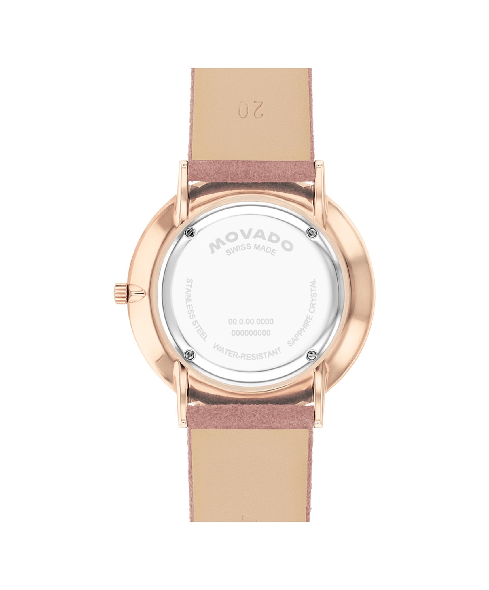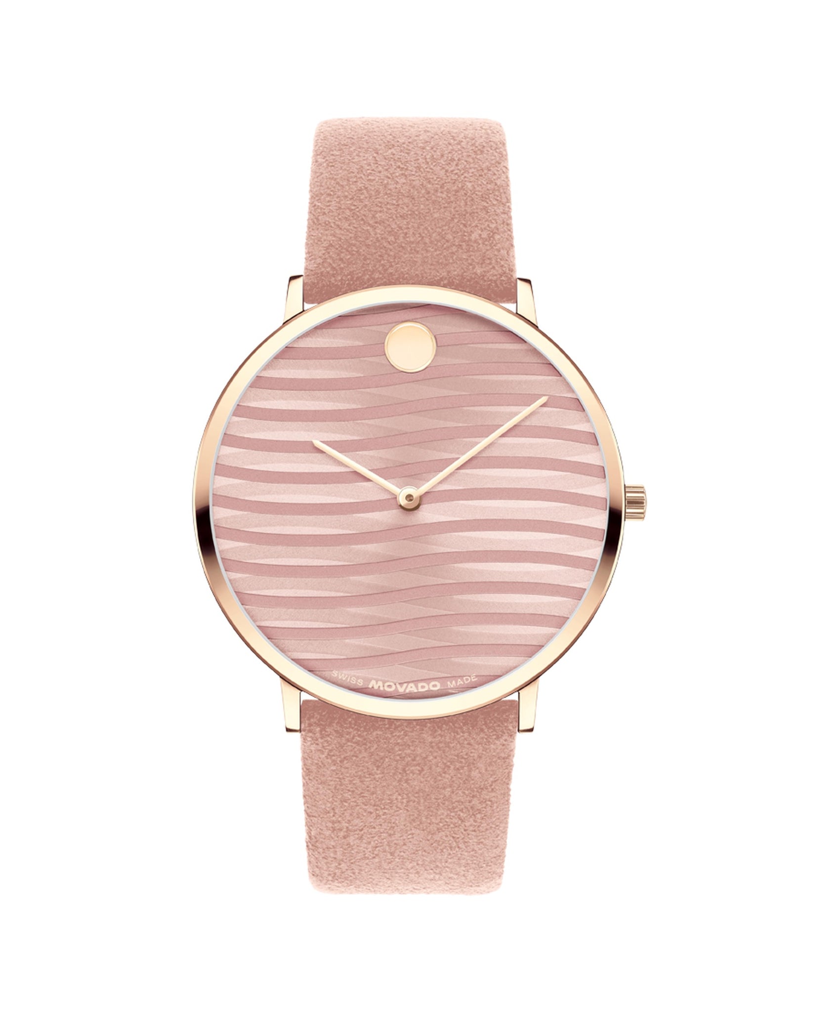 A reimagination of Movado's 1947 Museum Dial, the Modern 47 is a contemporary canvas for color and texture.Featuring a rose gold PVD case with a dark blush wave-patterned dial and Alcantara strap.