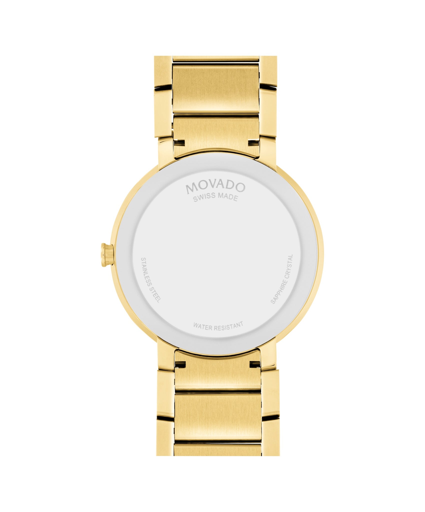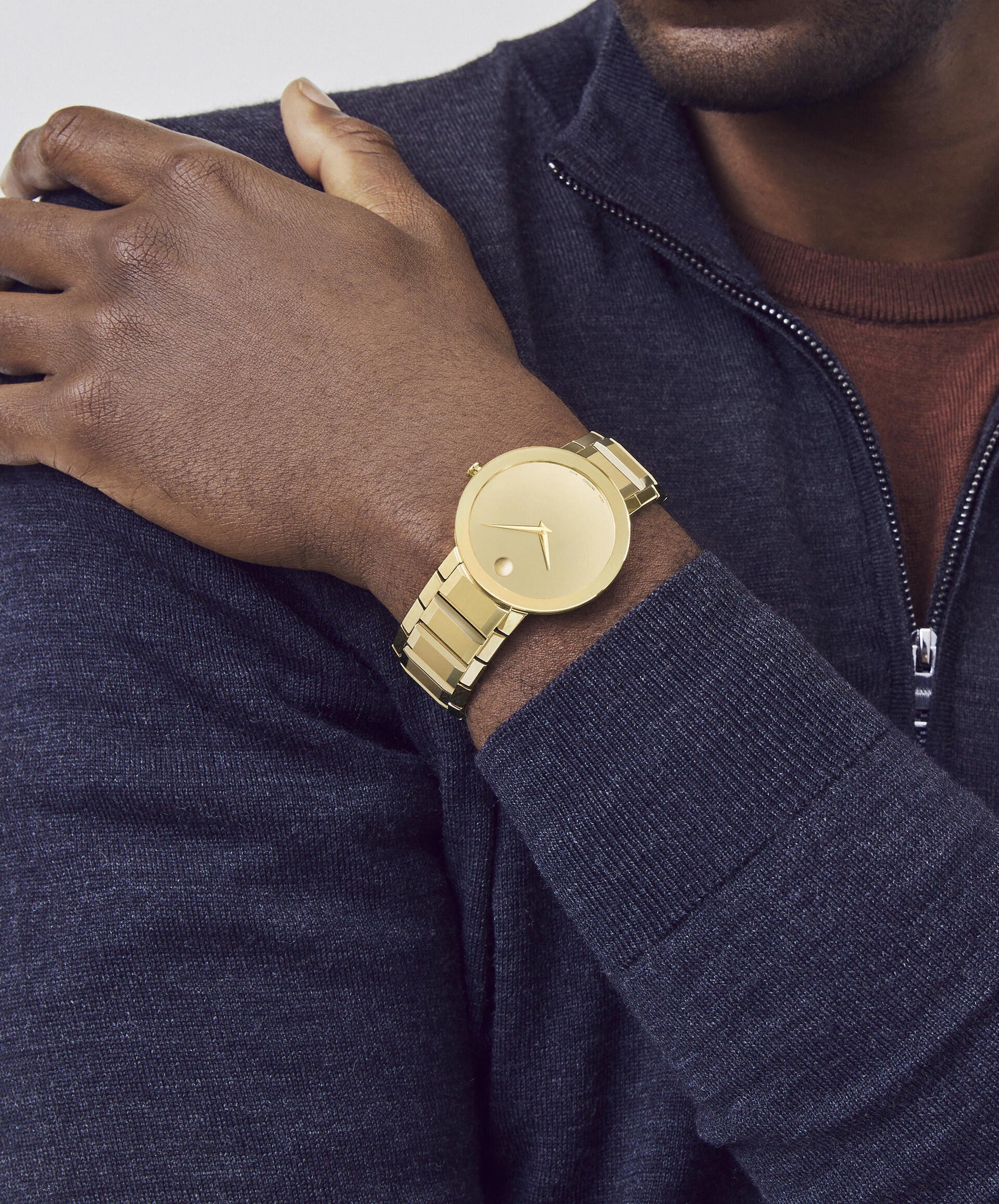 Movado Sapphire, 39 mm yellow gold PVD-finished stainless steel bezel-free case with flat edge-to-edge dark metalized sapphire crystal, gold-toned Museum dial and yellow gold PVD-finished stainless steel bracelet.