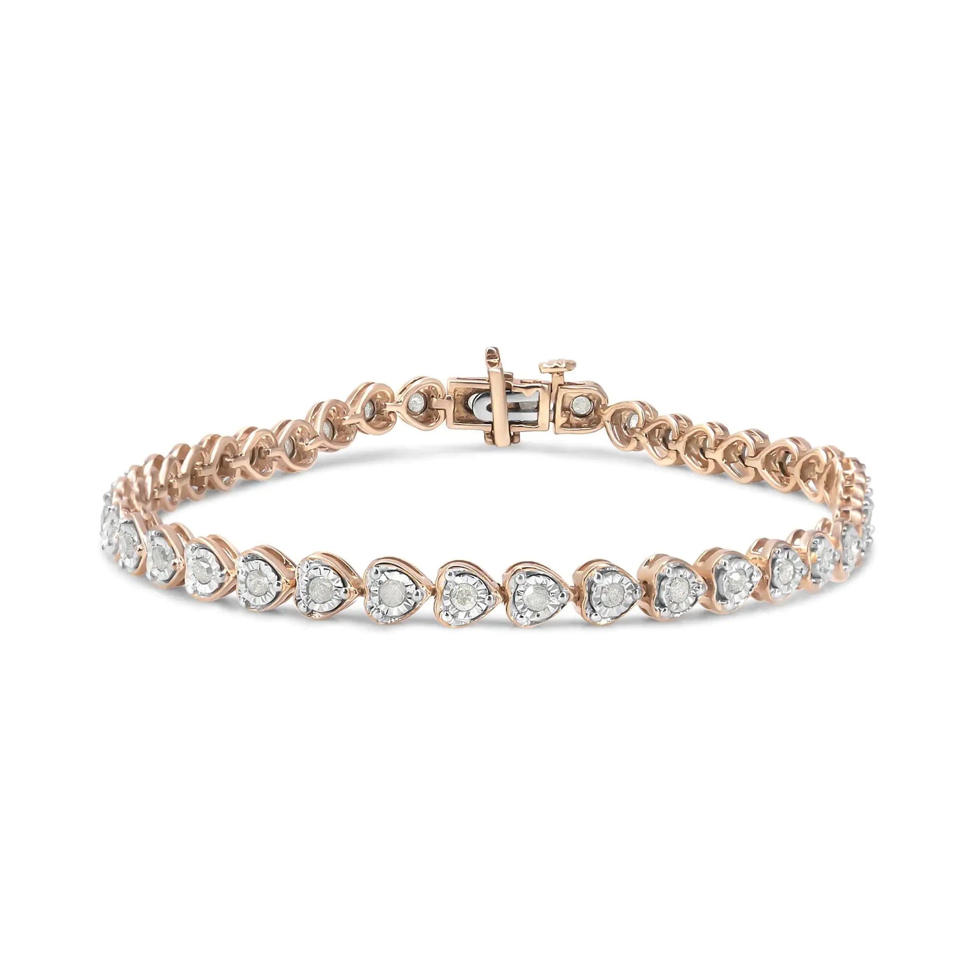 Create your signature look by wearing this elegant diamond tennis link bracelet. Featuring a seamless row of heart accents, adorned with rose-cut diamonds and set in a 10K rose gold plated sterling silver framing this bracelet has a classy appearance. This modern bracelet makes a perfect Valentine's Day gift, or as a unique twist on a promise ring; it's a classic romantic surprise she'll want to show off every day! Subtle yet dazzling, the bracelet comes with a sturdy clasp, which will allow this masterpiece to sit flat on your wrist.